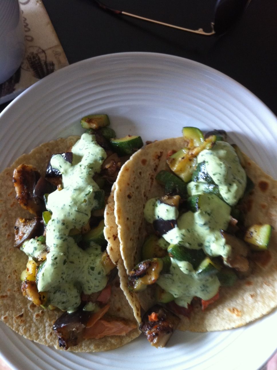 Today I made tacos on corn tortillas with leftover eggplant, zucchini, smoked salmon and topped with a creamy cilantro sauce. If you are having a group of friends over they are the easiest item to serve. You can prep everything before people come and then lay out a fabulous build-your-own taco bar.