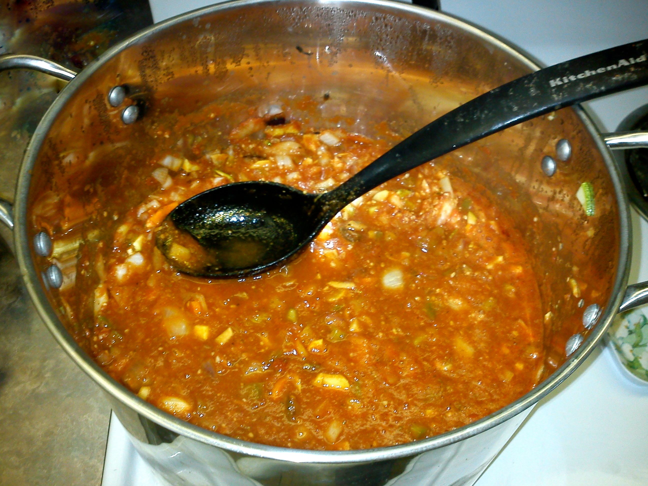 Once everything is in the stock pot, it may be over half full (sometimes it would be almost totally full when I had some large vegetables like eggplant diced up in it). You can choose to spice it up a few different ways, but this is how I do mine: