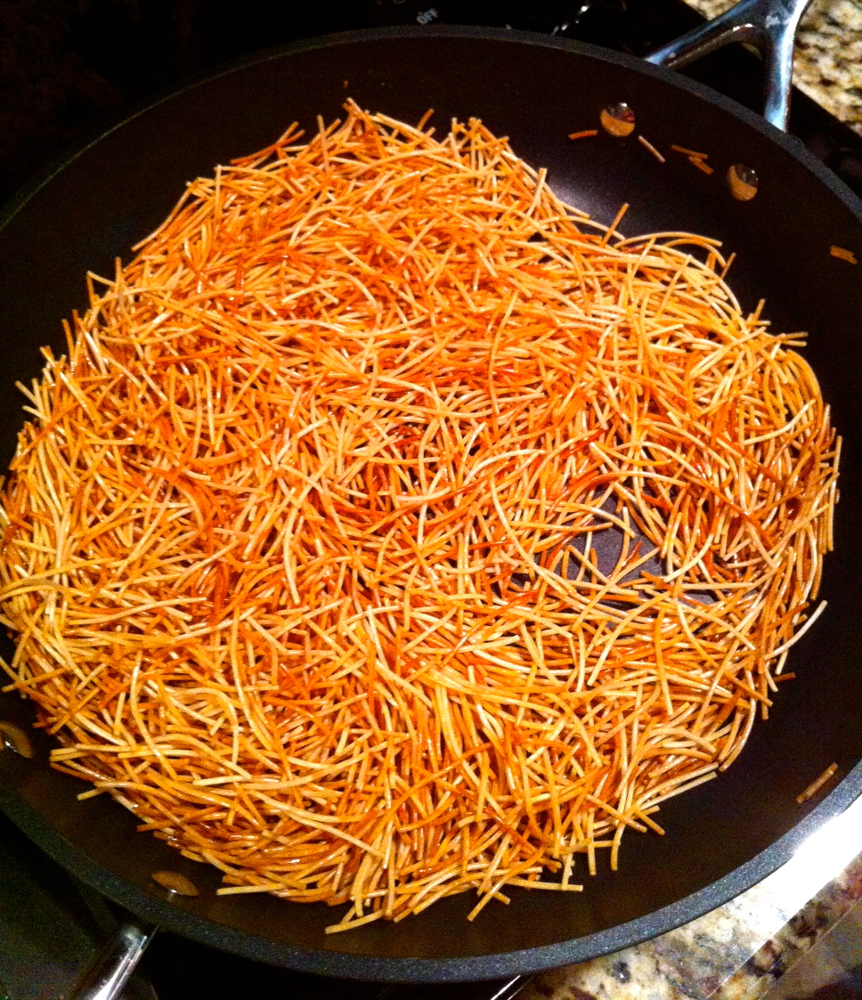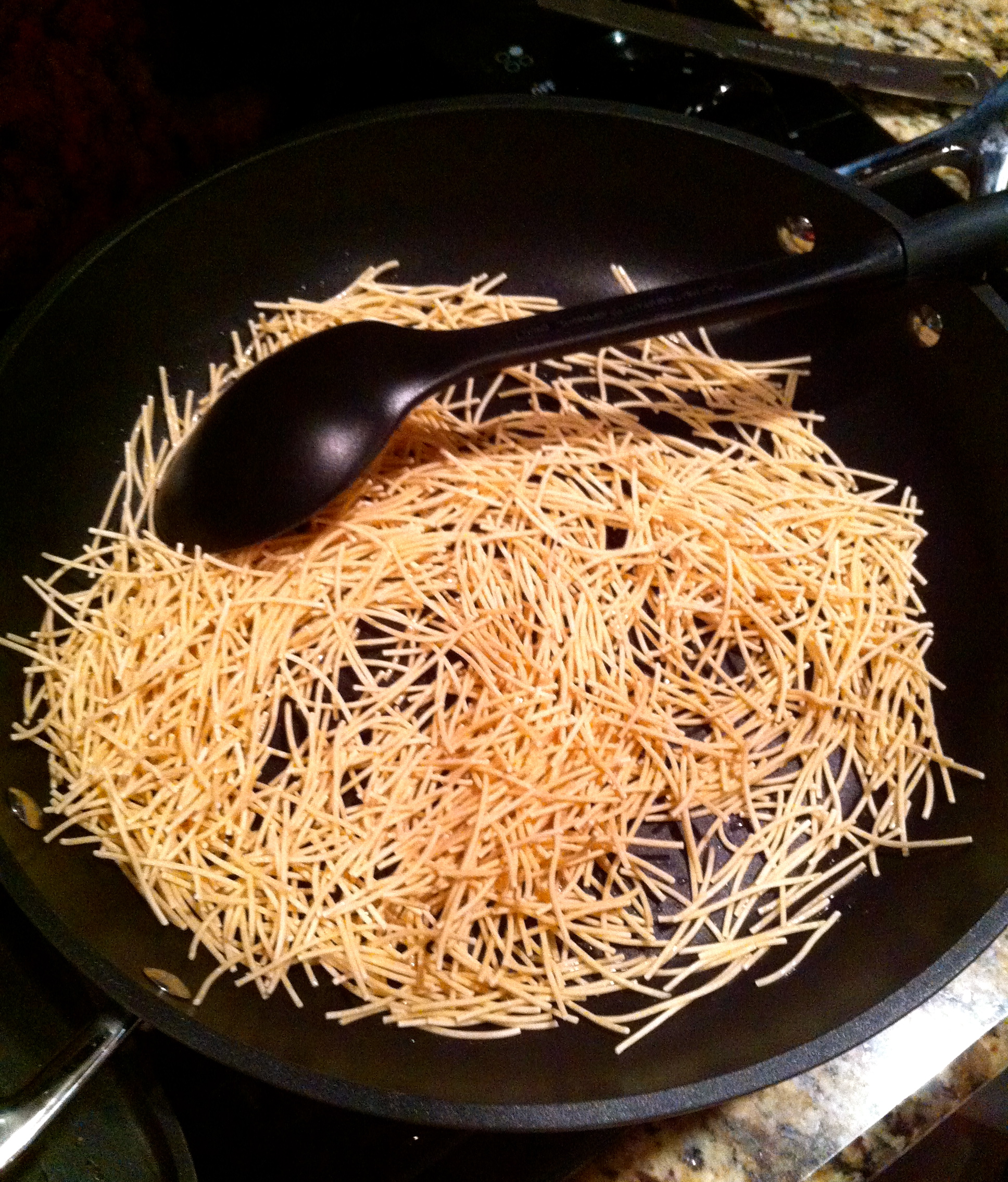 To start, allow the Fideo noodles to brown in the skillet with a bit of vegetable/canola oil.