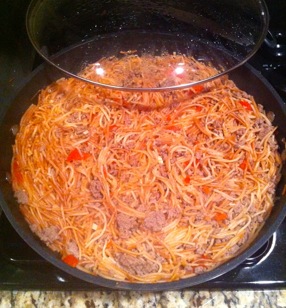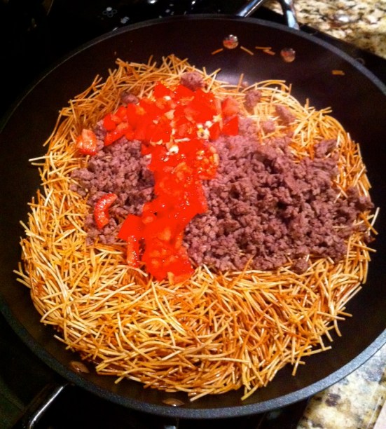 - Once the ground beef is thoroughly cooked add it to the Fideo noodles