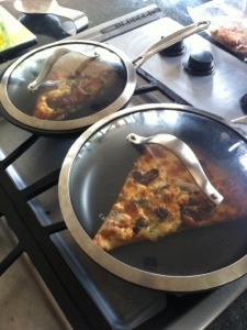 Thanks to my husband for picking this little tip up on YouTube. You won’t believe how simple re-heating pizza can be using a skillet and lid. First step is placing a slice of pizza on a dry non-stick skillet and covering with a lid. Turn your burner on medium.