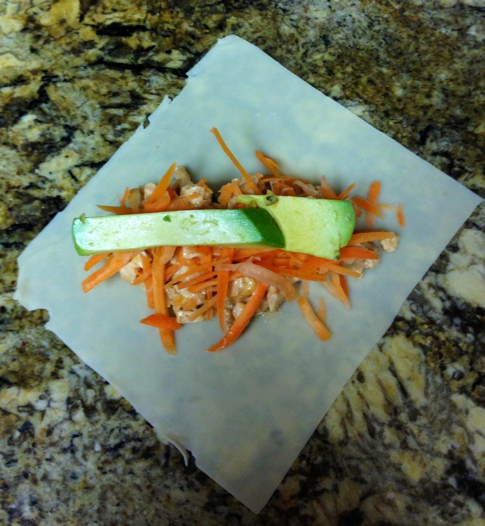 Step 1: Pick your fillings. I chopped up some cooked chicken breast and tossed in a coconut lime marinate. To add some crunch I used carrots and rounded my rolls out with creamy avocado slices.