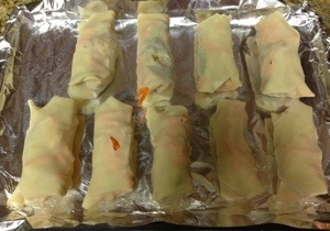 Step 6: Place your filled and rolled rolls onto a cookie sheet sprayed with non-stick spray. Brush the rolls with melted butter or olive oil to help them crisp up.