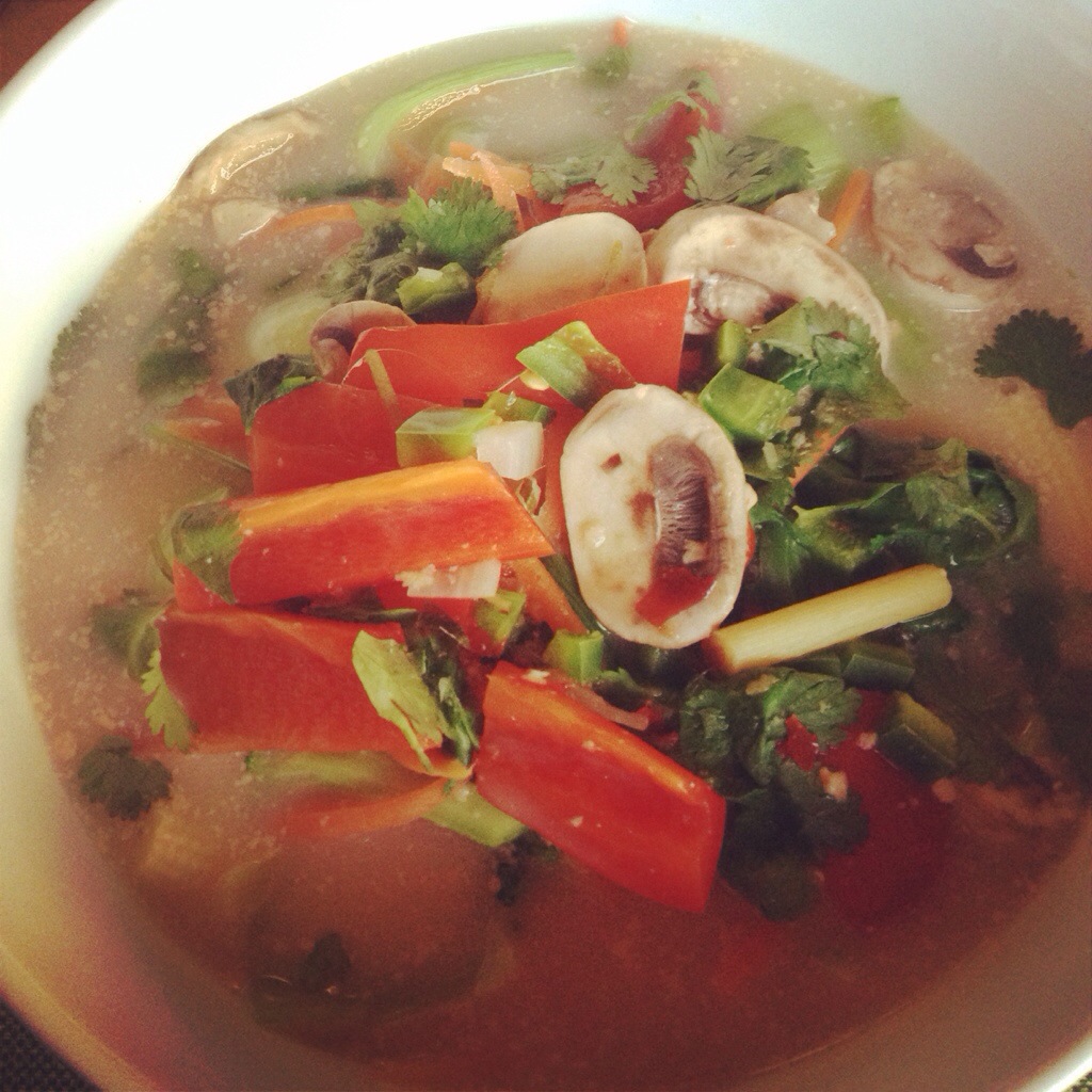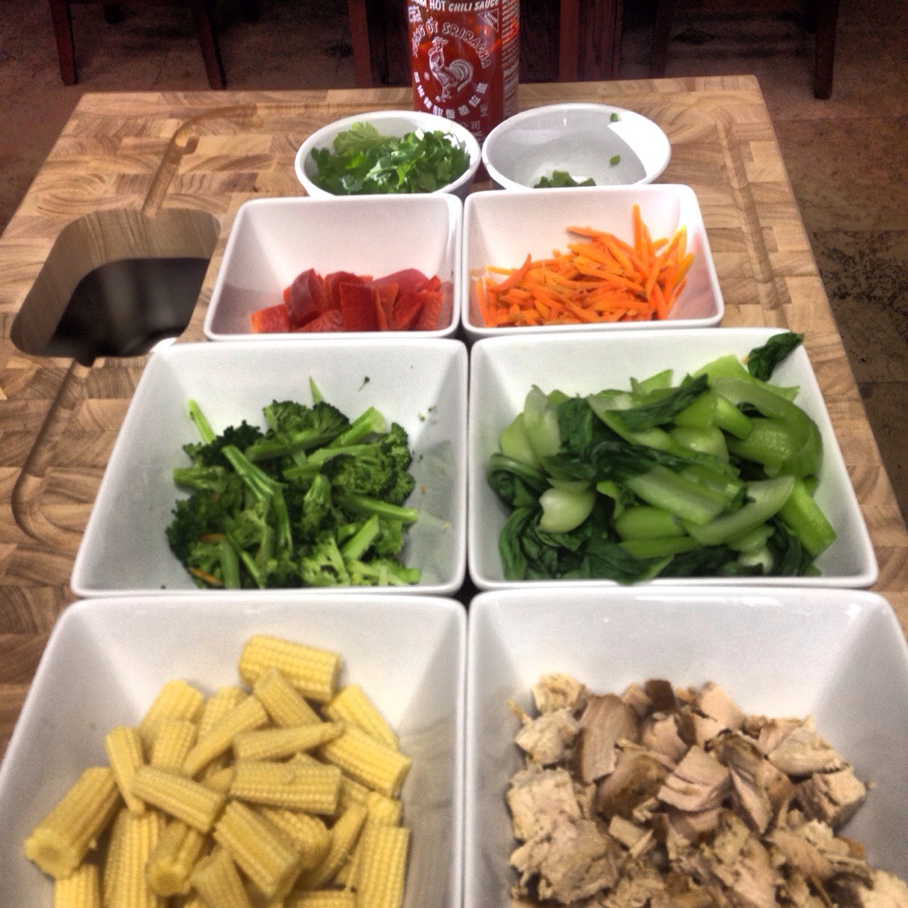 Like most great dinners out, I was inspired to come home and try to replicate the dish. I spent some time online researching which Tom Ka base I wanted to use and what vegetables to include in my home made version. I used this great recipe from An Urban Cottage to make my broth. I followed the recipe and really only swapped a bit of agave for brown sugar because I saw it first in the pantry. I also used reduced sodium chicken broth and low fat coconut milk. Next time I think I’ll go with full fledged coconut broth to improve the creaminess of the dish. To create our Pho station I prepared the following meat and veggies: