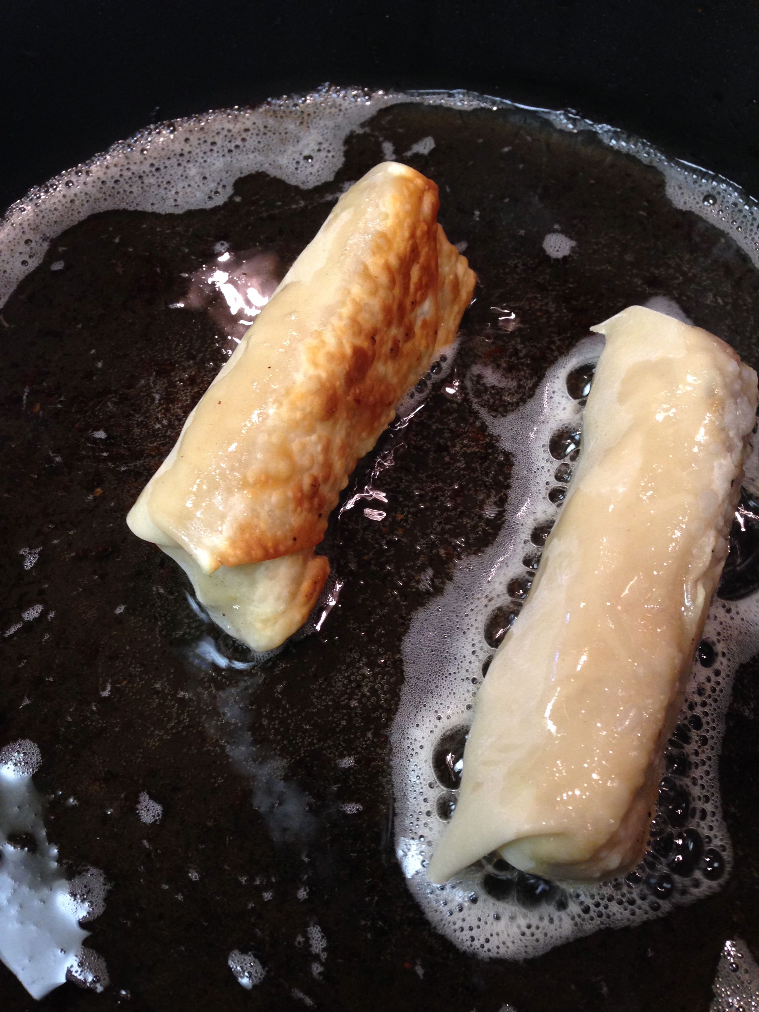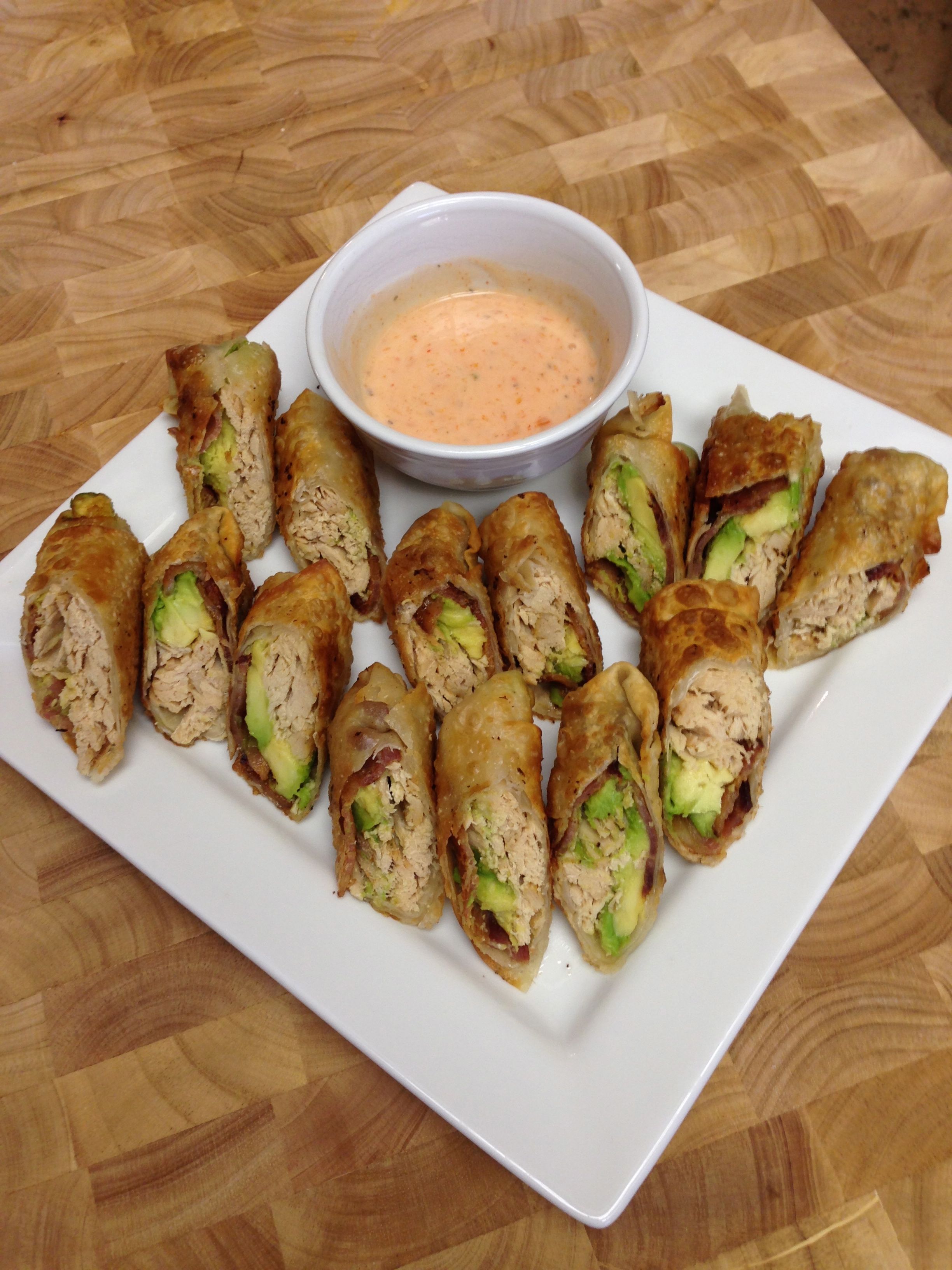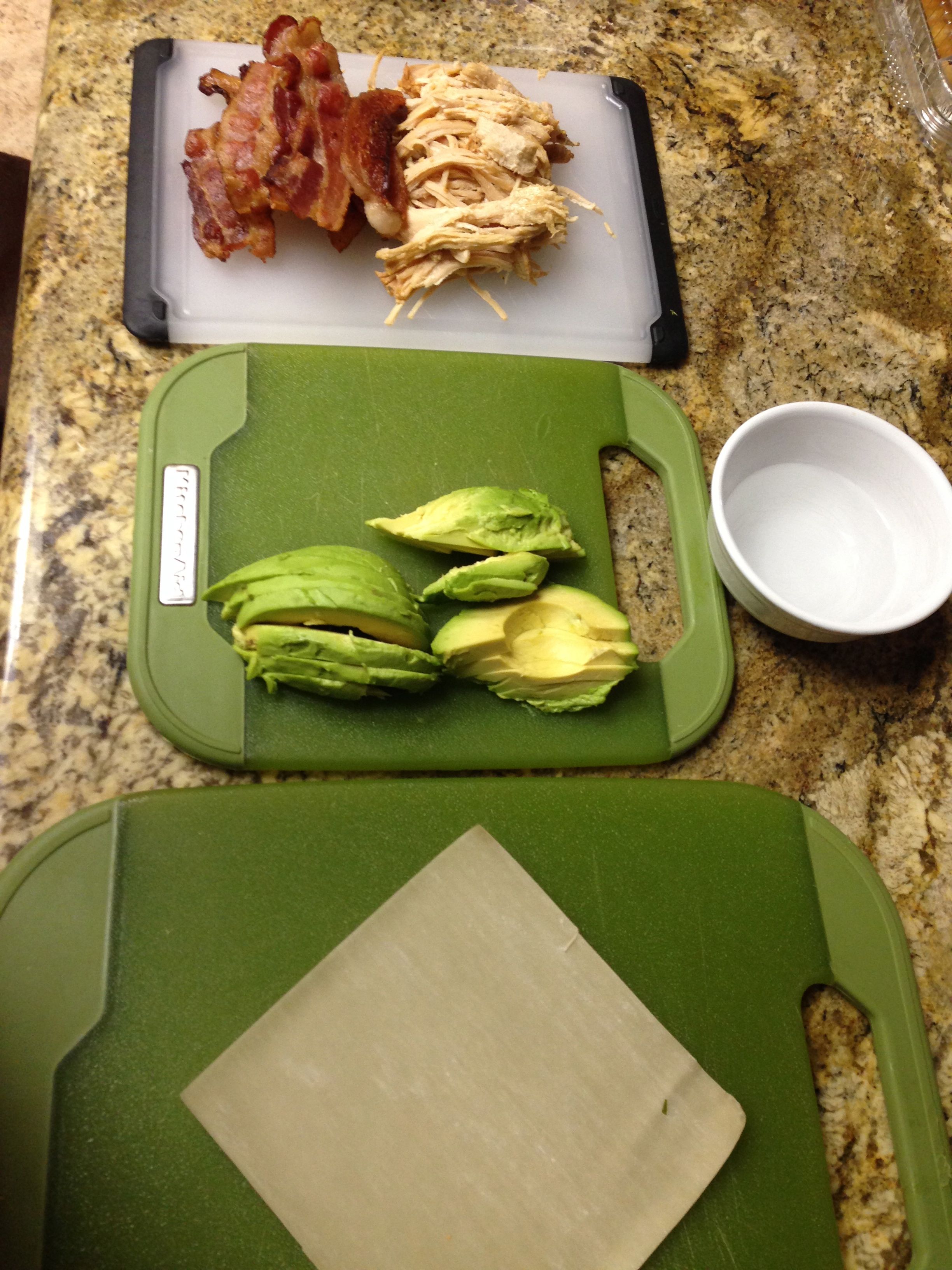 As I’ve mentioned before I love baking egg rolls, but sometimes you just want the rich flavor from pan or deep frying. Using a few items I had on hand I whipped up these tasty appetizers. I think you can’t go wrong with the combination of bacon, turkey and avocados. That combo makes an awesome sandwich so I figured they would be just as awesome in an egg roll. You could easily add any ingredients you wanted – just make sure you have something creamy and crunchy to get the desired texture.